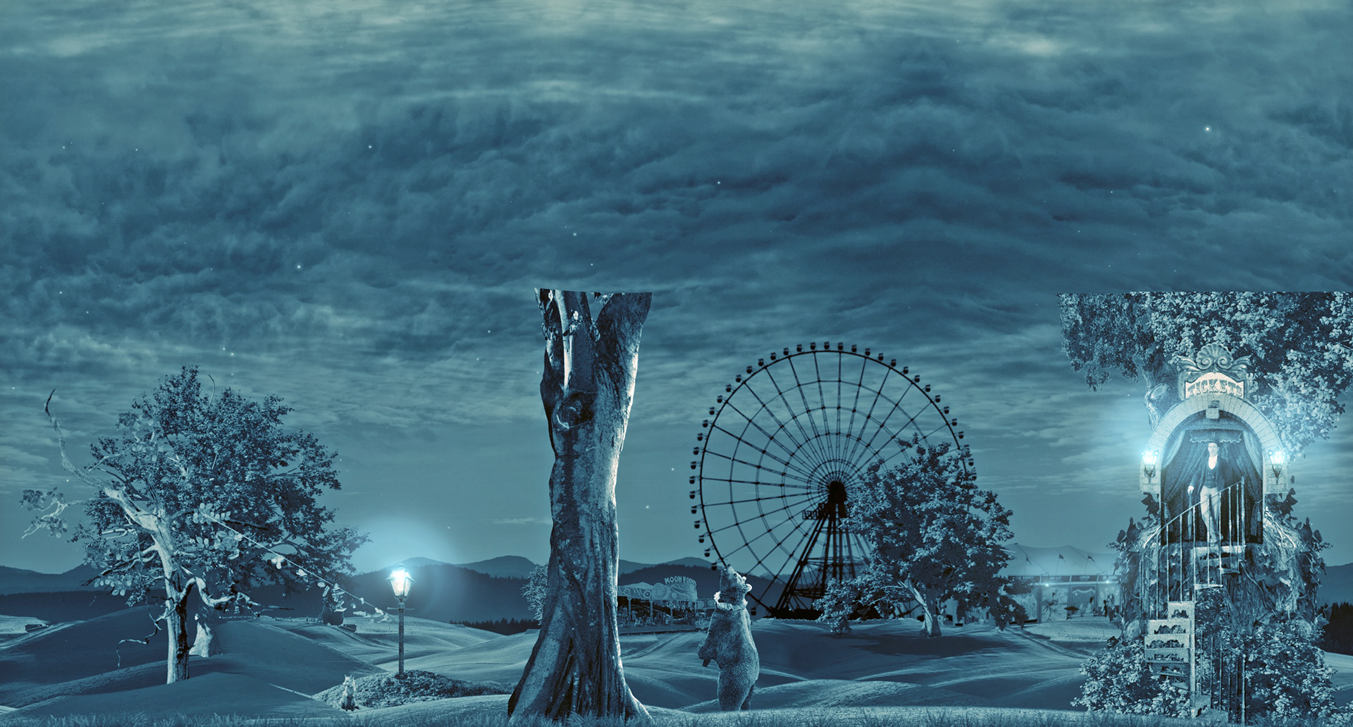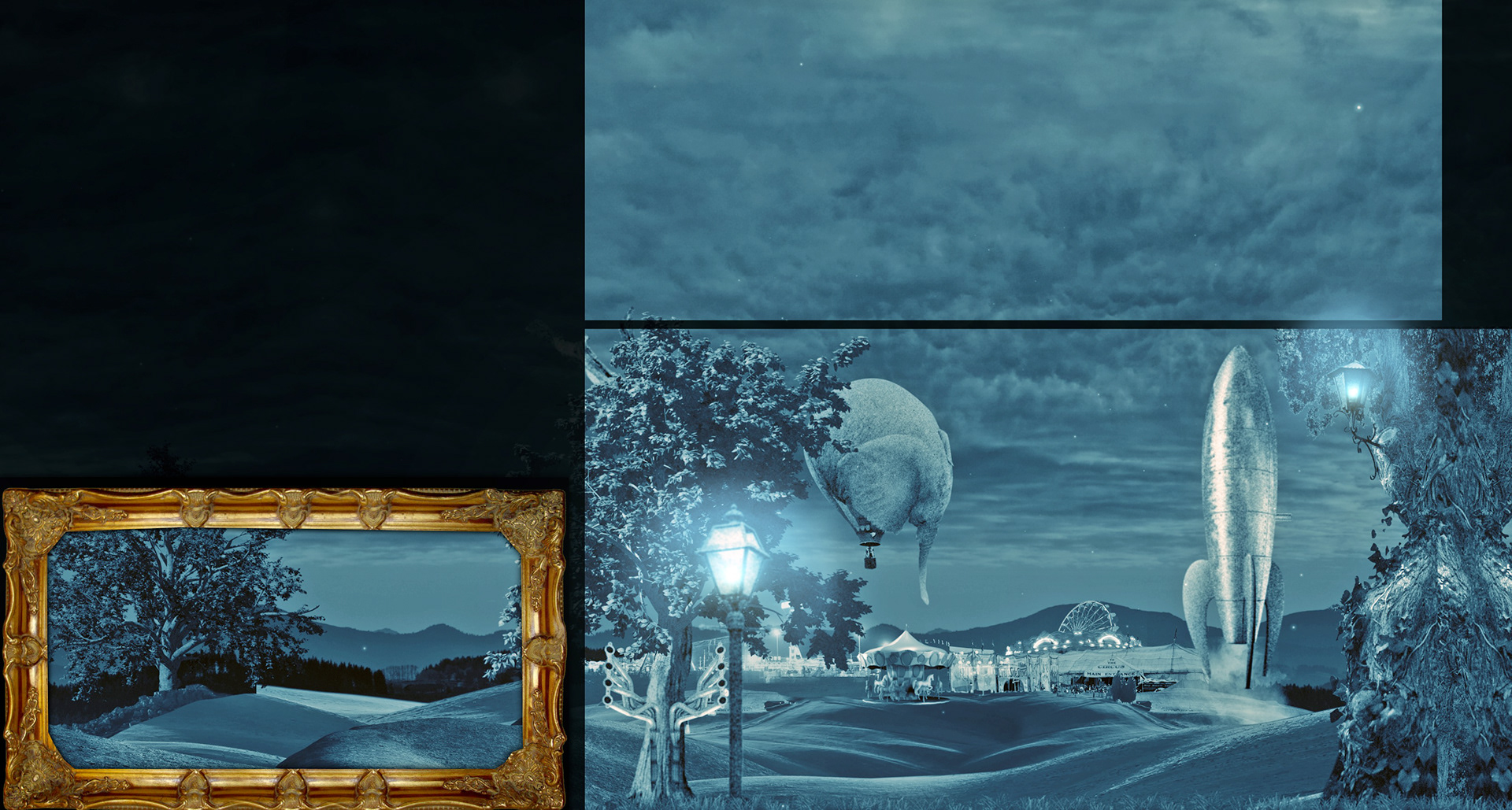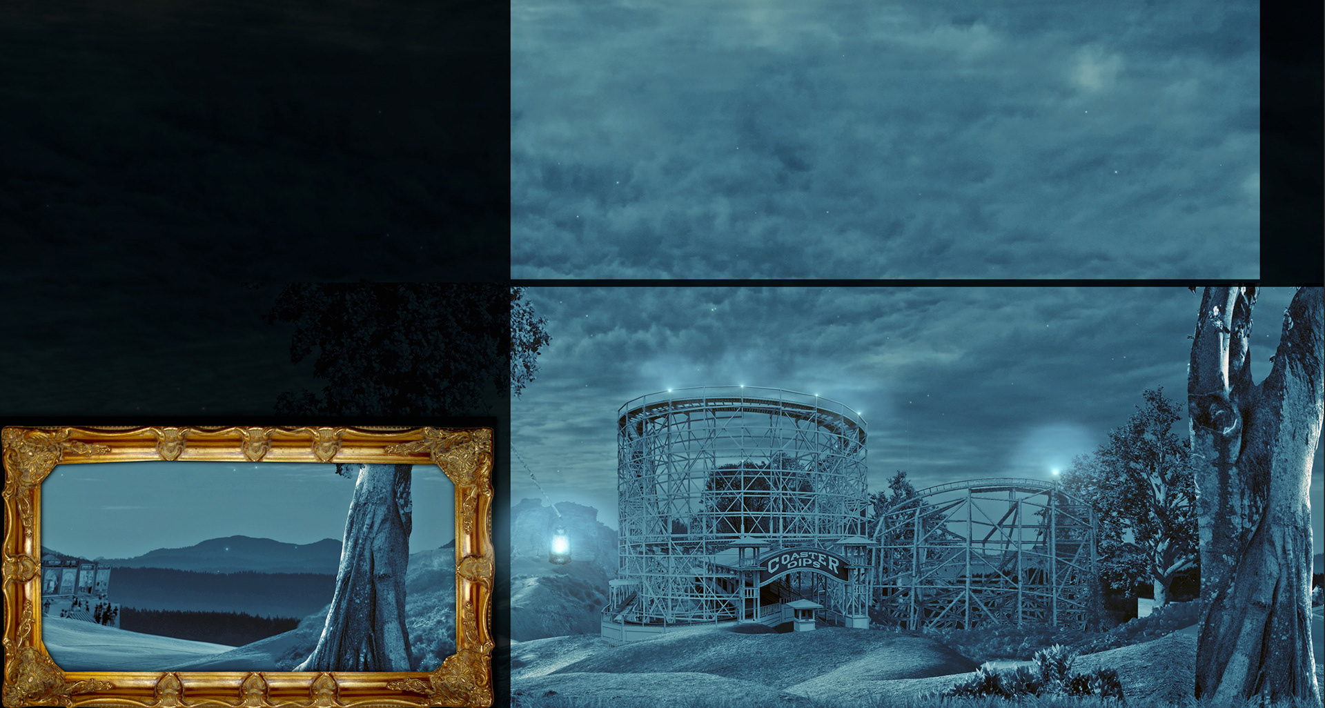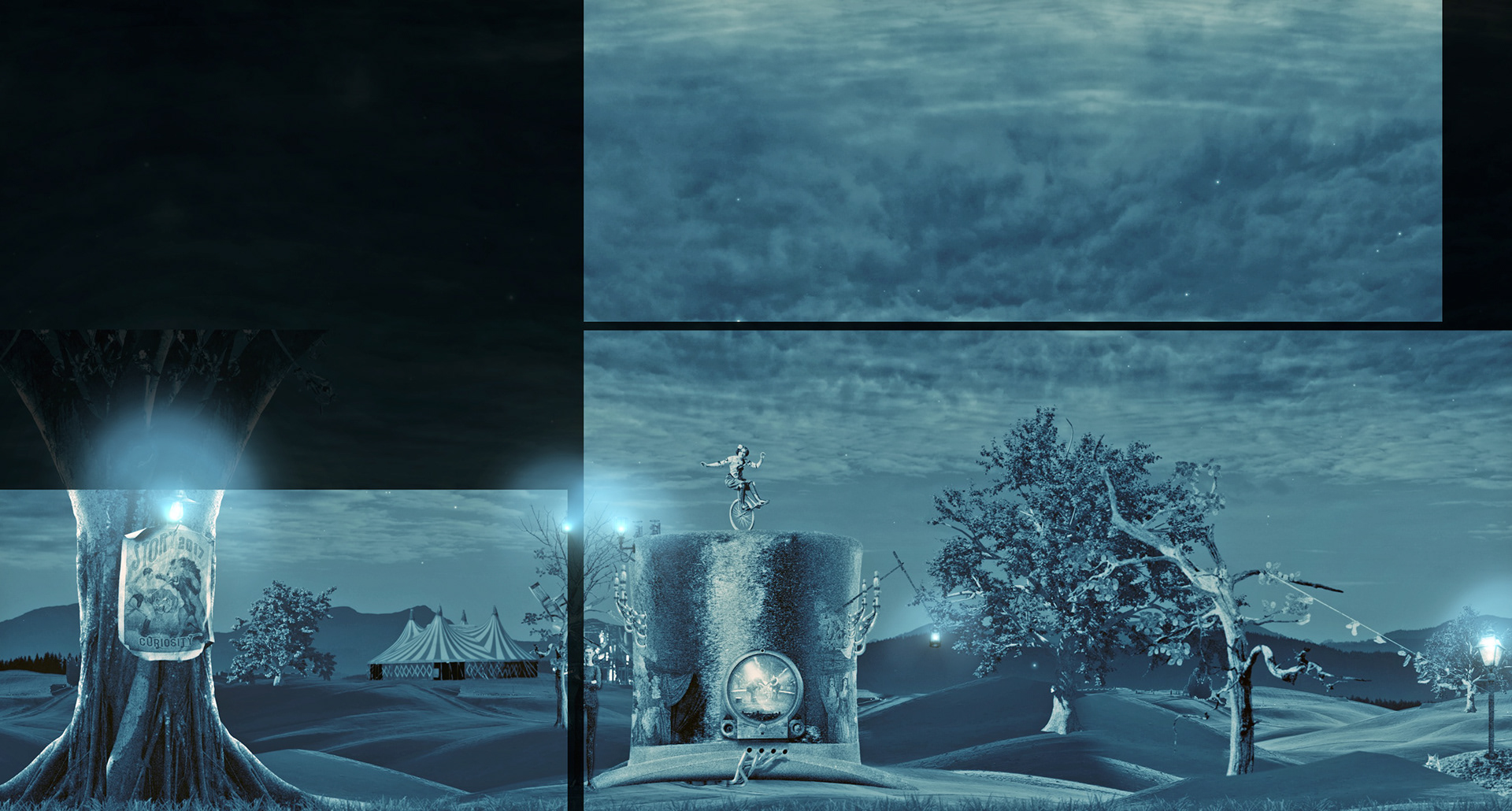 The scenes were a combination of original artwork, 2D graphics and video clips, composited into 3D space in After Effects.